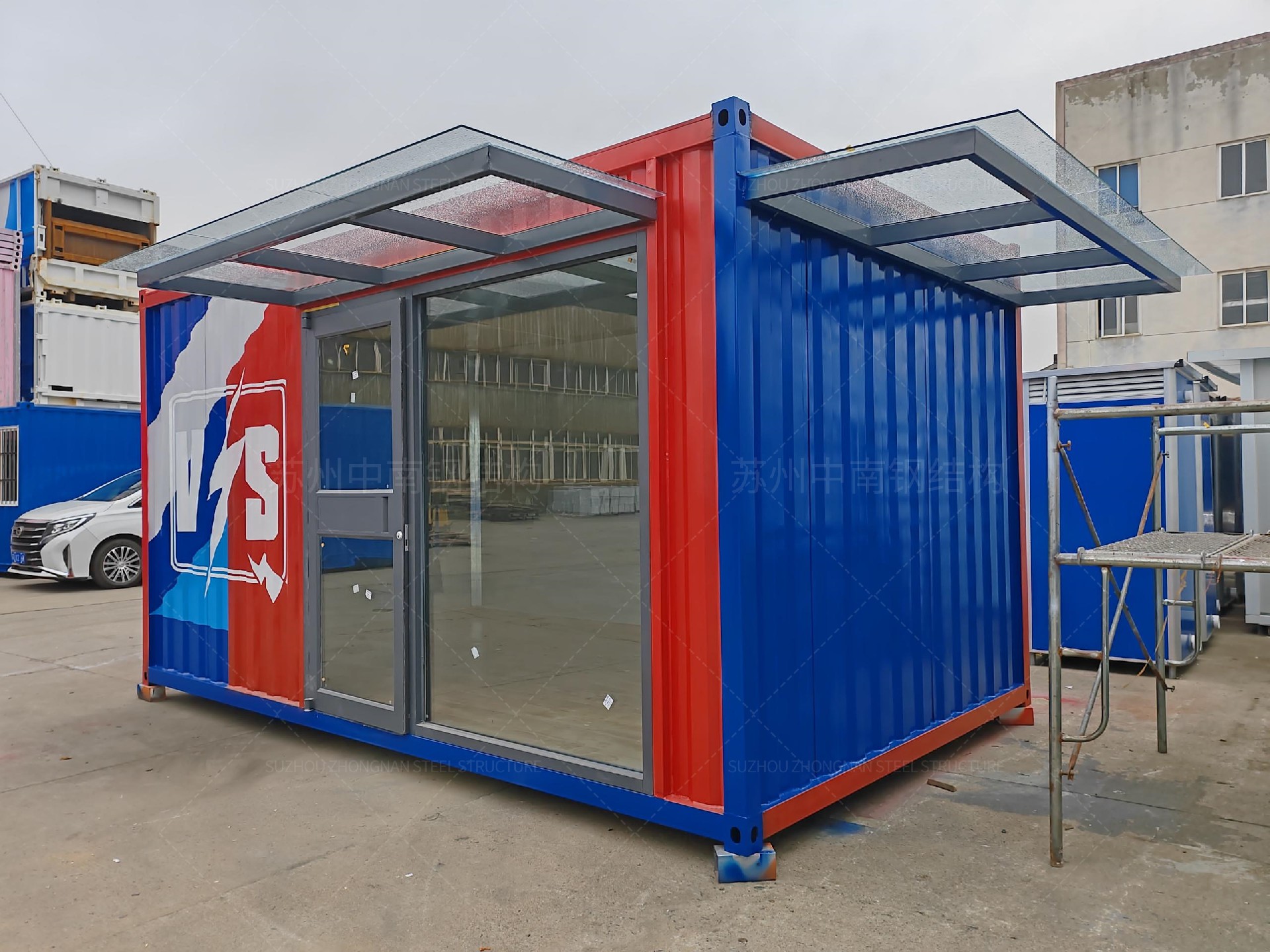 下面这款是我们公司做的一个集装箱小卖部,外观颜色鲜艳亮丽,迎合了当代年轻人的审美,色彩的冲击也会让商家在一众普通的商铺中脱颖而出。